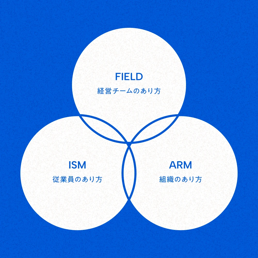 MISSIONを果たすために、私たちPDPでは、成長の場(FIELD)、価値観(ISM)、チームのあるべき姿(ARM)、三つの領域において、意識すべきこと、約束すべきことを定義しています。FIELDは、メンバーが仕事を通じて成長し続けられるための環境提供を約束し、ISMでは、日々の業務の中でメンバー一人ひとりが重視すべき価値観を約束、ARMではチームや組織の在り方やあるべき姿を約束しています。この三つをすべて守ることこそがMISSIONの達成、ひいてはVISIONで描いた社会実現へとつながると私たちは考えています。